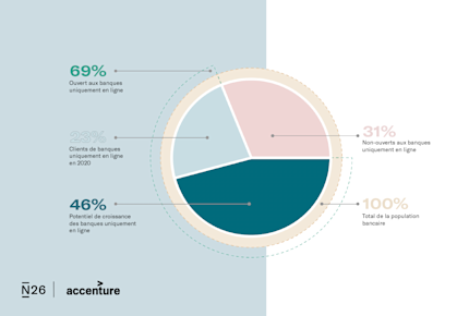 Sur les 28 pays sondés, le nombre de consommateurs possédant un compte bancaire dans une banque en ligne représentait 23 % de la population, soit environ 450 millions de clients. Et ce n'est que le début. Nos recherches révèlent que le nombre de clients des banques en ligne pourrait atteindre au moins 70 % de la population globale de chaque marché soit 1,4 milliard de clients potentiels pour les 28 pays concernés. De plus, près de la moitié des consommateurs interrogés affirment qu’ils seraient enclins à ouvrir un compte bancaire en ligne pour profiter d'un usgage 100 % mobile de leurs services bancaires du quotidien.